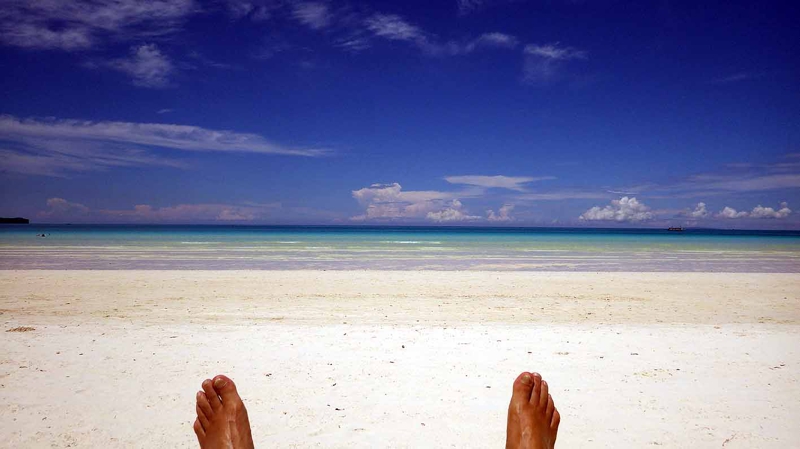 も海は綺麗でした。しかしこのPuka beachの青さも甲乙つけがたい素晴らしいところでした。ホワイトビーチ、Puka beachともにしばらくここに居続けたい感動がありました。やはりこんな処はもう一度来たい、いつもそう思います。家族でトラック諸島へ旅行に行き、その時体験した無人島ツアーの中で、ふと何もない水平線を眺めていた時、地球にこんな処があるんだ? としばし感動していましたが、2つのビーチでも正にその感動の再現でした。ともに波は静か、残念ながら他に観光客が多く、トラックの無人島のような「青い海独占!」と云う気持ちにはなれませんでしたが、こんな海を見ていると「また仕事に頑張れる、頑張ろう!」と云う人生の充実感に満たされます。あくせく働いている時ももちろん充実感はありますが、少なくともこの快感は感じることは出来ません。このホームページの冒頭に書いているように、はやり僕は海が好きなのですから……。